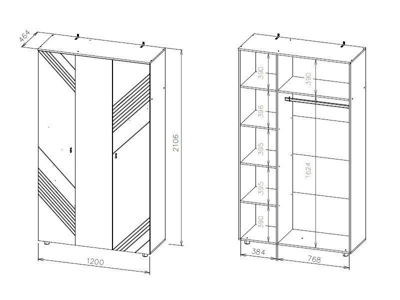 В левой части шкафа расположен отсек с четырьмя полками (одна стационарная и три съемных), в правой части шкафа расположен отсек со стационарной полкой и штангой (присадка под штангу отсутствует, покупатель устанавливает ее самостоятельно).